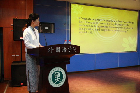 讲座中,蓝纯教授首先认知诗学的定义及其研究价值。接着通过通俗浅显、生动活泼的身边实例引出“角色/背景分离理论”,然后具体结合唐诗王维的“渭川田家”进行角色、背景分离的宏观、中观、微观三个层面进行分析,使人感觉王维的诗是“诗中有画,画中有诗”,王维不愧是著名的诗人画家;第二部分,蓝教授又以宋词里的词人与歌舞伎的中国典型爱情故事的脚本,结合“脚本理论”分析了柳永的“雨临铃”、秦观的“满庭芳”以及晏几道的“鹧鸪天”三首词,揭示出中国古典爱情脚本范式,使听众从一个崭新的视角解读中国宋词描写的古典爱情脚本;第三部分,蓝教授结合《宝积经》中的大量比喻用法,以“概念隐喻理论”从定量定性的研究方法进行了细致深刻的认知诗学视角解读,有理有据,令人信服。整个讲座,蓝教授纯正优美的英语表达,环环相扣的认知诗学分析,娓娓道来,带着听众进行认知师学视角下唐诗宋词和佛经比喻,耳目一新,豁然开朗,获益匪浅!