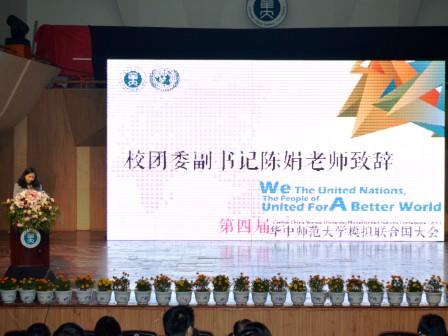 校团委副书记陈娟在致辞中对本次模拟联合国大会寄予了很高的期望。她说,模拟联合国活动的举办,必将激发青年学生们对国际事务的关注,教会大家更好地用国际眼光来看待世界问题,为世界和平贡献智慧和力量。