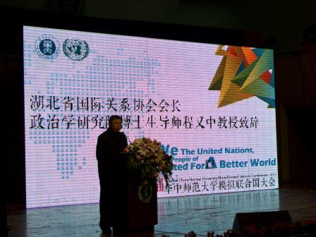 湖北省国际关系协会会长、政治学研究院博士生导师程又中教授在讲话中说,他每次都参加模拟联合国大会活动,感觉我校的模拟联合国大会一届比一届成熟,希望这个活动能继续深入推进,进一步扩大它的规模和影响力。