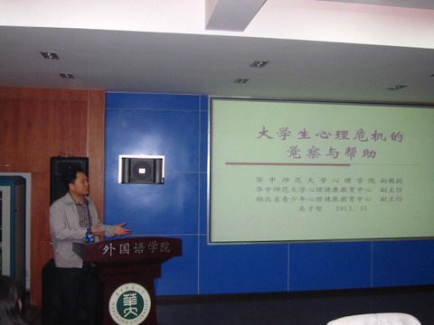 大会的第五项由湖北省大学生心理健康教育中心副主任吴才智老师对班主任老师进行了题为“大学生心理危机的觉察与帮助”的心理健康教育讲座。
