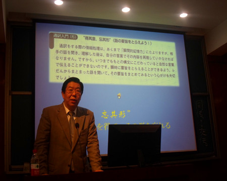 李俄宪教授开场介绍道,吴川教授毕业于北京师范大学,现于日本大学研究生院和国际关系学院担任教授,并发表了众多关于中日语言方面的著作。此外,吴川教授也曾在日本电视节目《中文讲座》中担任主持人,主要讲关于翻译原则的应用篇。今天,他便将他所录制的13次节目的录音资源与大家一起分享。 过程中,吴教授特别强调了同学们在日常翻译中的一些误区,并带领同学们学习掌握口译的方法。他说道,其实同声传译并不像传说中那样神奇、准确,由于时间限制,翻译的精度一般会降低,最高也只能达到60%的精准度。因此,在同声传译的时候,一定要做到口耳分开。老师形象地比喻说,这就像初弹钢琴时两只手不能协调一样,但是只要多加训练,就能达到熟能生巧的境地。