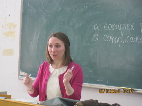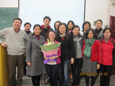 教学研讨活动的第一个环节是观摩Lauren Savo的读写公开课。Lauren Savo老师来自美国马里兰洛约拉学院(Loyola University, Maryland),2012年8月起在公共外语系任教。 Lauren老师本次教学内容为大学英语读写译第四册第一单元。上课之前,Lauren老师首先介绍了与即将到来的美国节日St. Patrick’s Day(3月17日)有关的风俗习惯,巧妙地将学生带入了轻松的英语学习氛围。在接下来一个半小时的时间里,Lauren老师先是细致深入地讲解了本单元所涉及的重点词汇,结合美国生活实际分析了相关单词和语法在当代美国的用法,接着她带领全体同学对课文内容进行了宏观把握,突出讲解了课文中的重难点。在整个授课过程中,Lauren老师清晰响亮的语音,严谨活泼互动的教学风格,联系实际的精准讲解,深深地吸引了全班六十余名学生,也感染了所有到场的老师。下课时,在场的师生对Lauren老师精彩的讲课报以热烈持久的掌声。