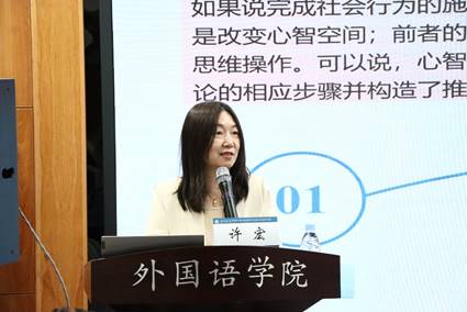 第三位主讲嘉宾是上海外国语大学许宏教授。许宏教授在题为《俄语学术语篇中的元话语结构功能研究》的报告中,简述了元话语的定义、形式和类型,如引导式元话语,运用语料库语言学方式,分析俄语学术语篇中元话语结构的功能,如标记思维操作,激活话题、提出假设、总结概括,框架标记、态度标记、自我提及标记等,使基本话语的“语义图案”明晰可见,指出,这些元话语结构都具有固定性,是成语的主要组成部分,如обратим внимание, что; то есть; в том смысле; одним словом等,丰富了成语的本体研究视域。