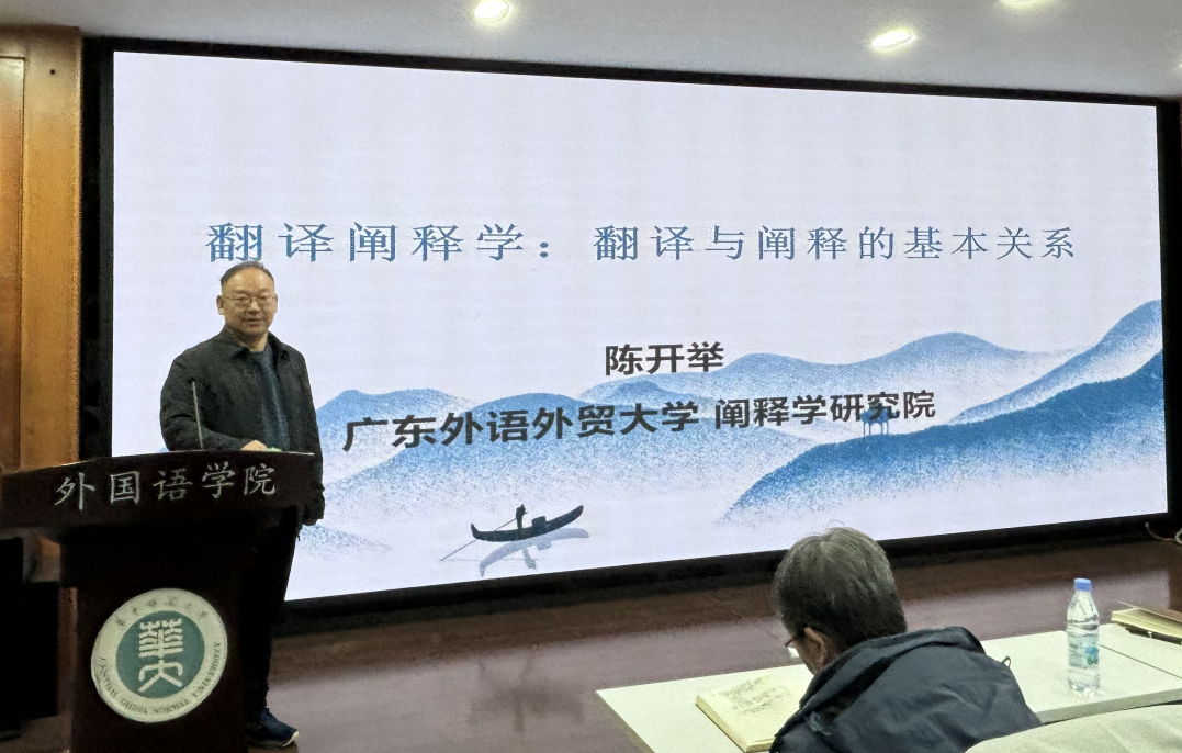 2024年12月9日下午,广东外语外贸大学阐释学研究院院长、博士生导师陈开举教授应邀在华体会在线平台3504教室为学院师生做题为“翻译阐释学:从翻译的阐释转向说起”的学术讲座。本次学术讲座由华体会在线平台翻译与传播研究中心主办、华体会在线平台副院长、翻译与传播研究中心主任苏艳教授主持,翻译专业研究生和部分教师出席了本次讲座。