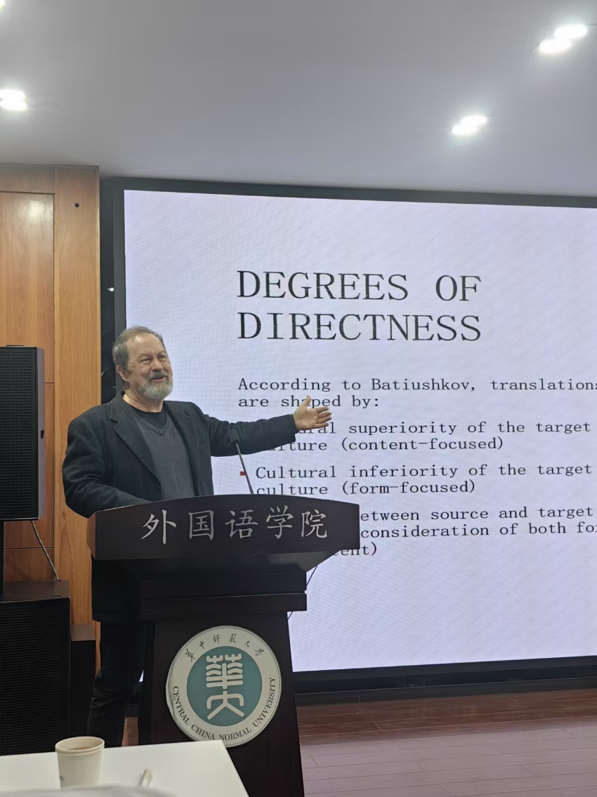 Baer教授系列讲座围绕转译、翻译与时间、苏联早期翻译研究、翻译与世界文学、翻译与流散族裔等话题展开。在第一场讲座中,Baer教授认为,虽然现代翻译主张直接从源语翻译成目标语,但历史上出现的转译现象也反映了当前翻译规范及翻译主体性质的转变,因此翻译史上相关学者对转译的论述值得关注。