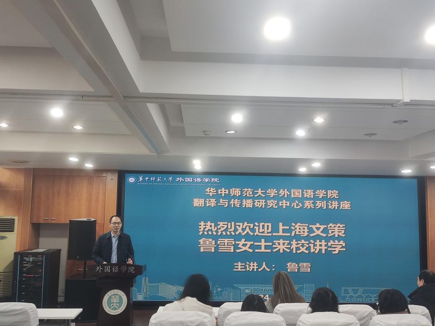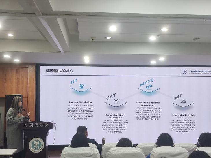 在人工智能技术飞速发展的今天,翻译行业正经历着前所未有的变革。为使我院学生更好地理解这一变革并把握未来职业发展的方向,我院于2024年12月19日下午举办了一场主题为“AIGC在语言服务中的应用案例”的行业前沿讲座。本场讲座由上海文策国家语言服务出口基地的高级培训师、翻译项目经理鲁雪女士主讲,她以其丰富的行业经验和独到的见解,为在座师生带来了一场思想的盛宴。讲座吸引了多位翻译方向教师和2024级MTI研究生参加。学院党委副书记罗舰莅临现场指导。MTI教育中心覃江华教授主持讲座。