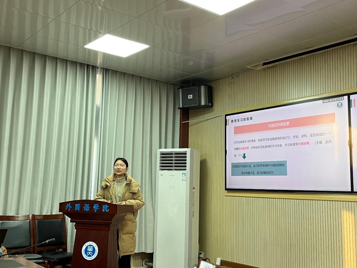 之后,扈丹同学以武汉市第一初级中学(金雅校区)的实习经验为例,分享了自己在教育实习中的主观感受和情感体验。在实习期间,她体验了期待、钦佩、质疑、激励、感恩、成长、伤感与期待等多种情感,恰似一场丰富的教育之旅。初入校园时的期待与对带教老师的钦佩,为其开启教育实践之旅;授课中的质疑促使其自我反思,进而在激励中改进教学。她感恩与学生、教师、同伴的相处及学校提供的机会,在班级活动、听课评课、汇报课等经历中成长。实习结束时,她期待以成熟心态回归教育,秉持初心,在教育路上继续前行。这一段打动人心的实习经历分享,给同学们带来了极大的鼓舞,启示大家要积极面对实习挑战,营造与自我及他人的和谐关系,努力将教育实习转化为丰富而有意义的学习经历。