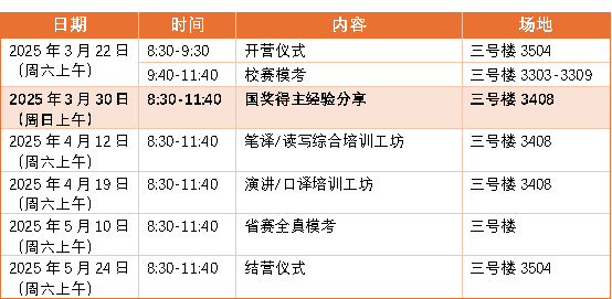 备赛训练营后续精心策划了一系列的活动。3月30日(本周日上午8:30-11:40)训练营第二场重磅活动即将于三号楼3408教室拉开序幕。本环节为国奖得主“黑箱战术”首公开。届时,国际传播综合能力国赛指导教师童扬芬将领衔国赛金奖得主梁恬菁同学、银奖得主王棵同学为大家呈现即兴演讲的现场魔鬼训练;翻译国奖指导教师谭华也将带领国赛银奖得主覃舒婷、铜奖得主冯心怡同学慷慨分享经过实战检验的制胜秘籍!敬请出席!