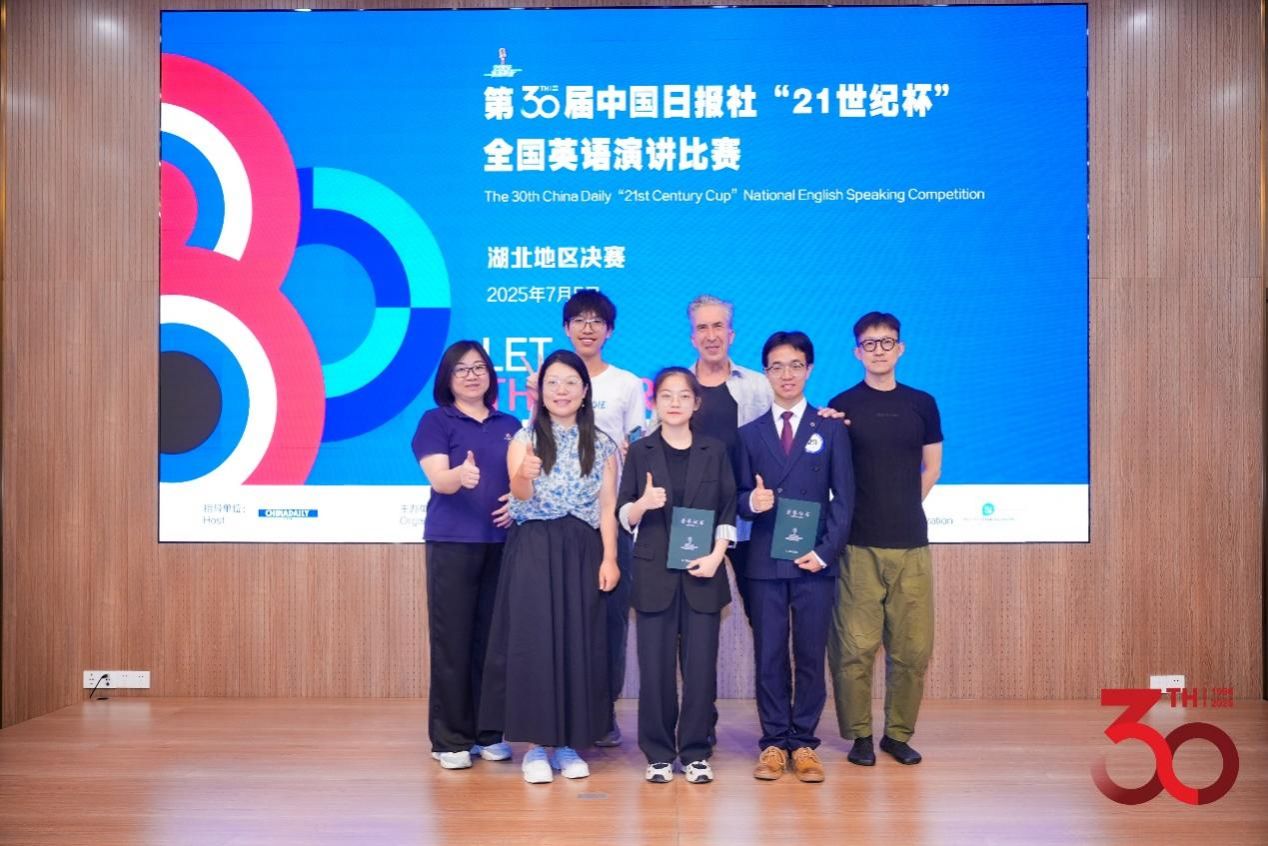 2025年7月5日,第30届中国日报社“21世纪杯”全国英语演讲比赛湖北赛区决赛在华中农业大学圆满落幕。我院乔相如老师、陈志红老师指导的2023级英语翻译专业潘莉丽同学荣获湖北省亚军、晋级国赛,2023级英语师范专业王志利同学获得三等奖。演讲队张乐老师和张成铭同学也到比赛现场观摩学习,为两位选手加油。