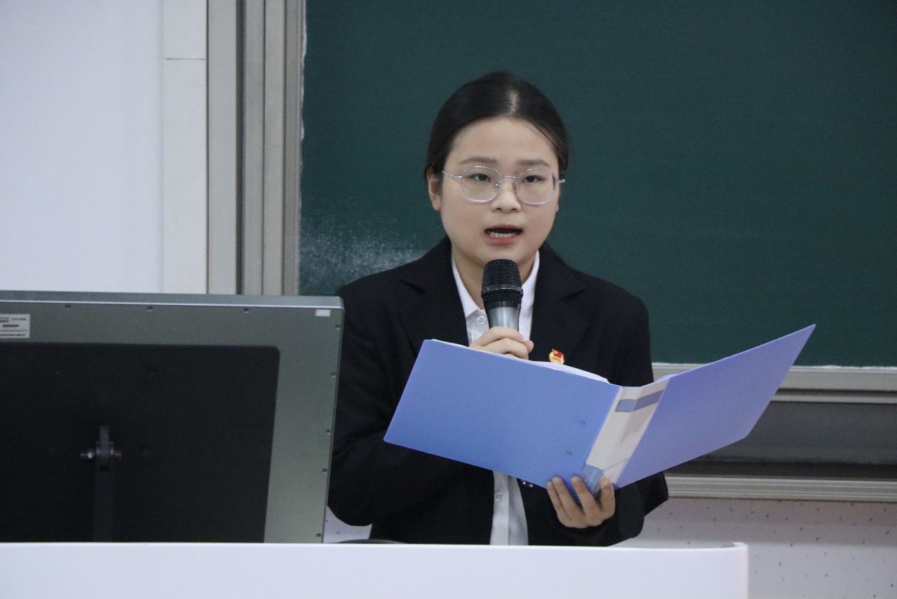 学院团委副书记(学生)伍语涵发言。她希望大家以专业负责的态度服务师生,在一言一行中做好典范,牢记章开沅老校长对外院学子的寄语,营造温馨和谐的氛围。她鼓励大家同心共进,传承好“外院出品,必属精品”的优良传统。