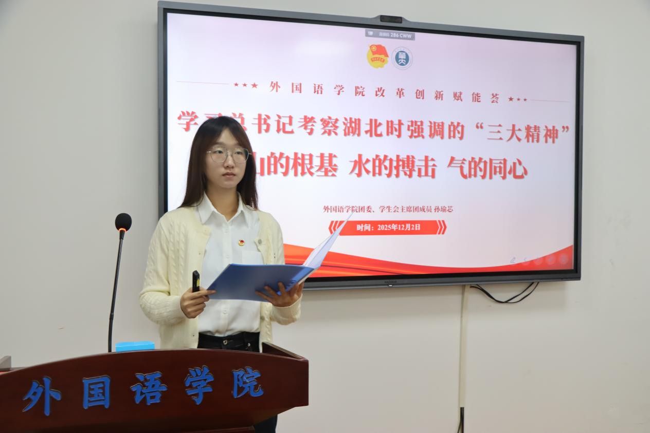 孙瑜芯围绕《学习习近平总书记考察湖北时强调的“三大精神”》进行分享,从“山的根基”大别山精神、“水的搏击”抗洪精神到“气的同心”抗疫精神,鼓励青年从三大精神中汲取前行力量,执笔书写未来。