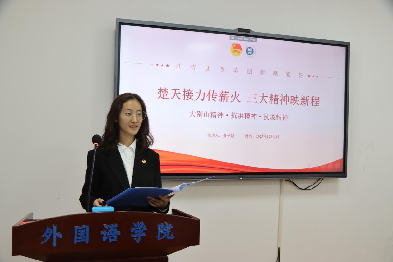 查子妍以《楚天接力传薪火 三大精神映新程》为主题,结合湖北地域特色与革命传统,讲述了大别山精神、抗洪精神和抗疫精神的时代内涵,并联系实际提出在实践中践行三大精神,展现青年担当。