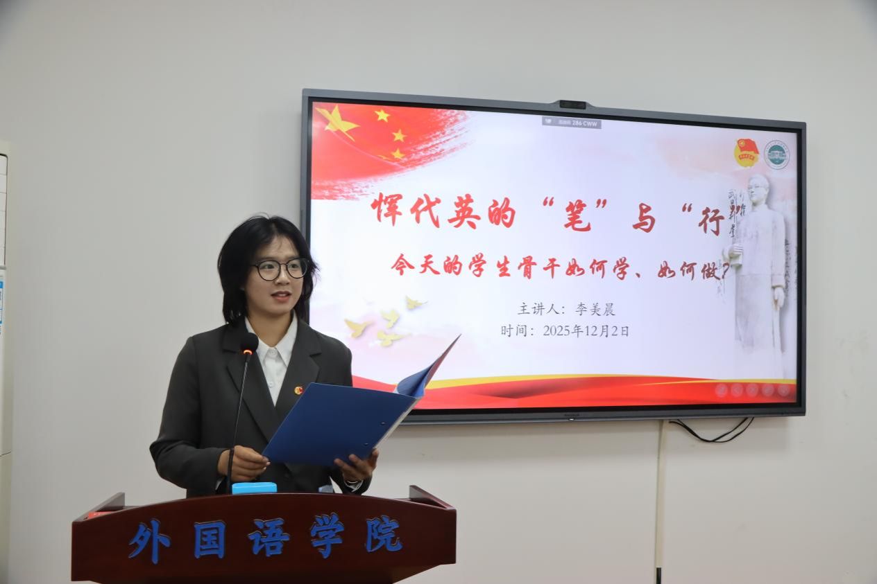 李美晨以《恽代英的“笔”与“行”——今天的学生骨干如何学、如何做?》为题,回顾了恽代英的革命事迹与精神传承,并倡议当代青年应认真学,认真做,让红色基因深植于心、践之于行。